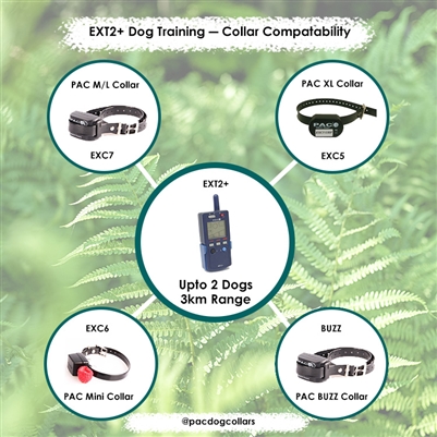 This PAC dog Kit comes with an EXT+ handset, which can be simply changed to enable the simultaneous exercising of up to two dogs. It also comes with a Miniature/Small Dog Training Collar, which is ideal for smaller dogs like a Bichon Frisé or Cockapoo and up. We also use a weight guide of suitable for 3.5kg and over. If you want to add more collars, check out the ADDONS TO CONSIDER section below. Note we have a compatibility chart included with the product pictures showing what collars will suit this handset. You can also click to see all our Dog Training System Collars Here.